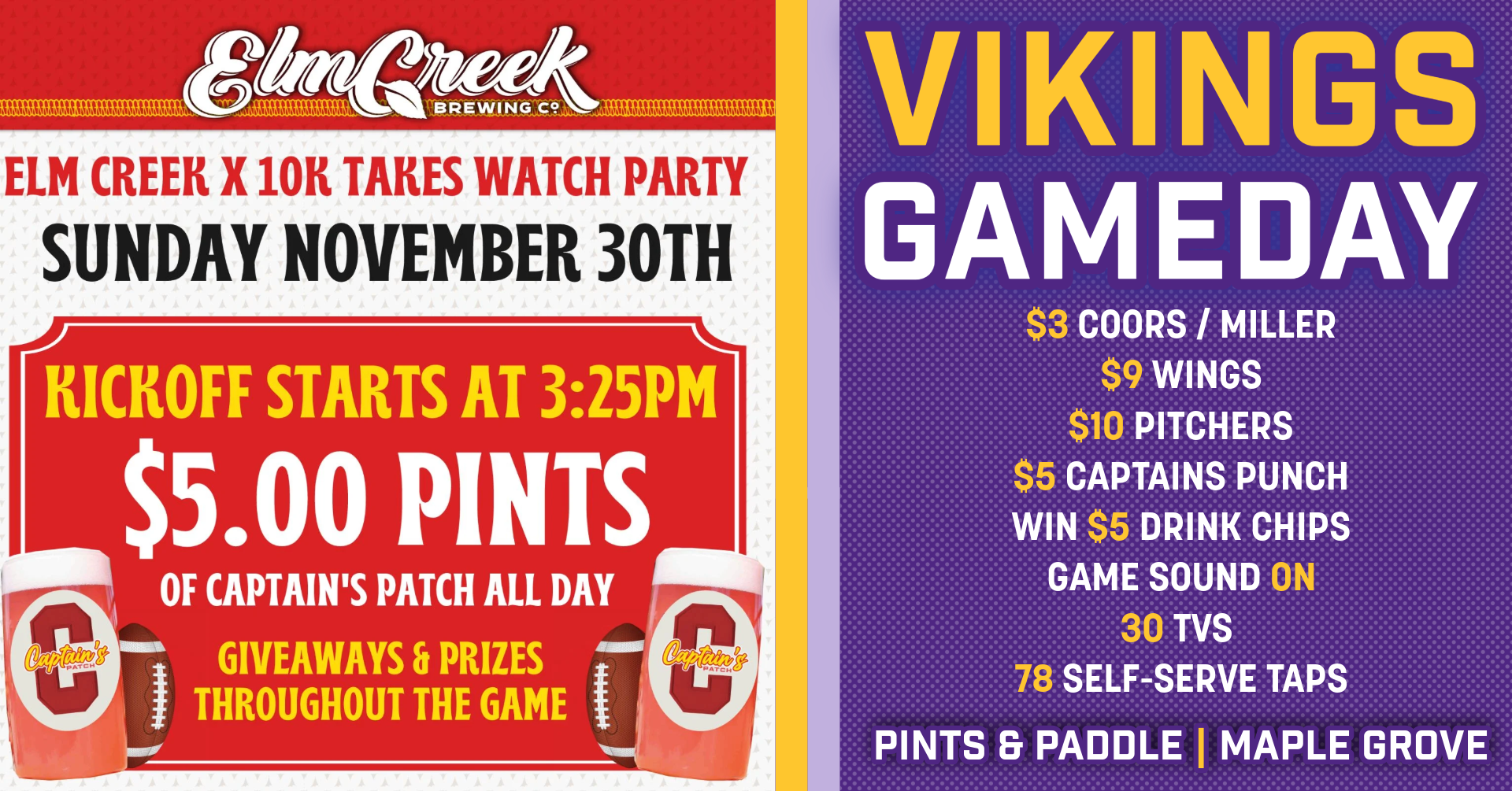15450 Grove Cir N, Maple Grove, MN, United States, Minnesota 5536910K Takes and Elm Creek Brewing will be joining us for the Vikings vs Seahawks game! With 30 TVs, 78 self-serve taps and our scratch made American kitchen, this is your Gameday watch spot. π Gameday Grub & Drink Specials π» - All Game: $9 Traditional or Boneless Wings. - Drink Up: $3 Coors/Miller Pints […]
